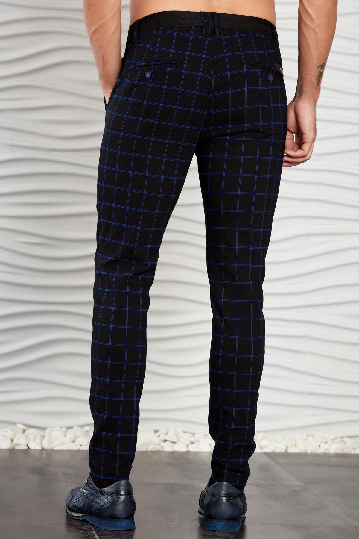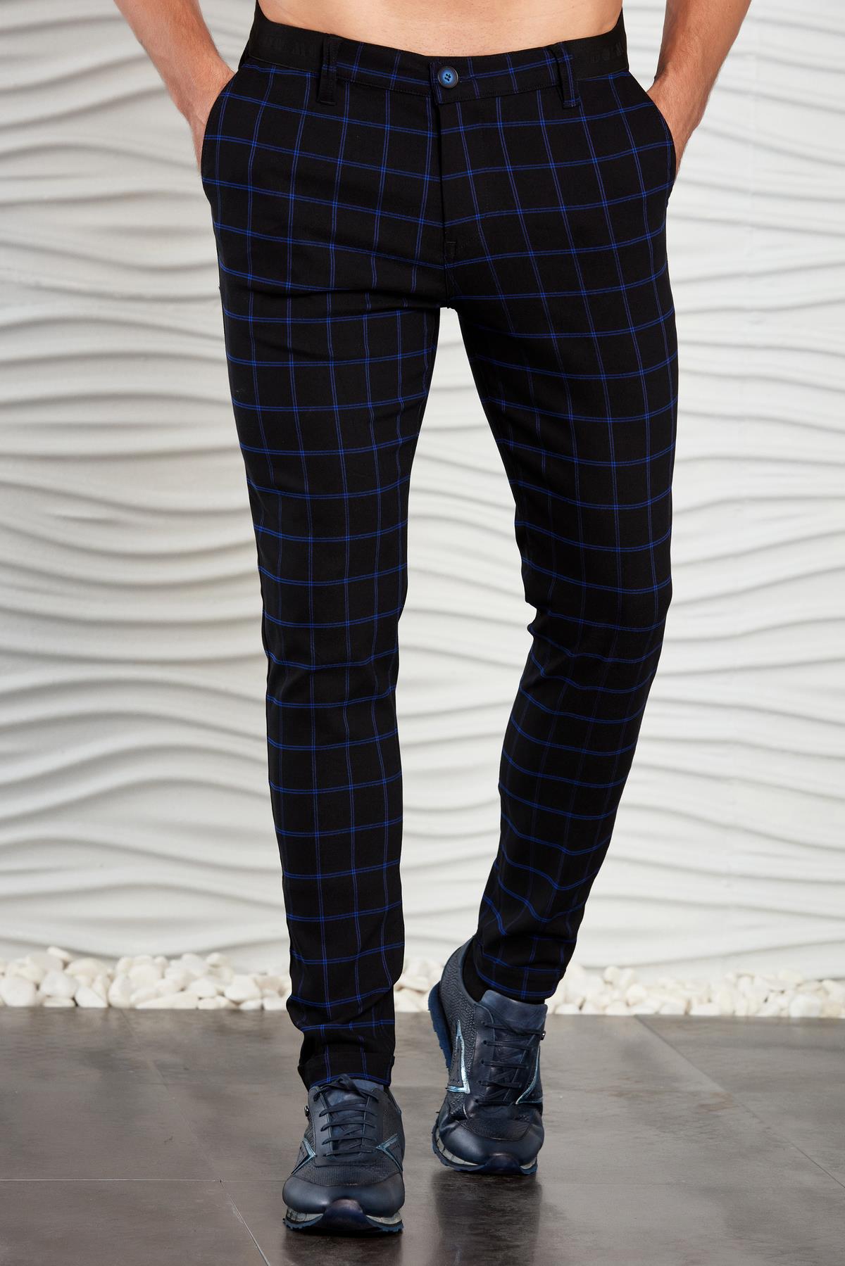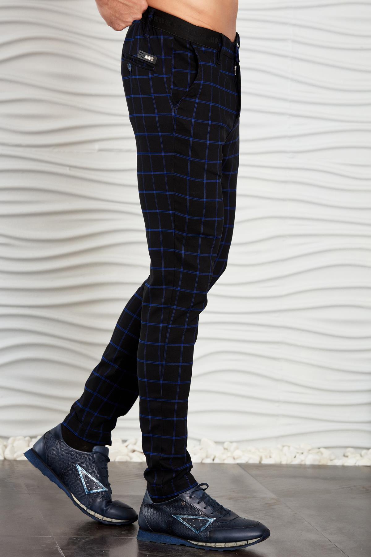 Siyah-Saks Kareli Beli Lastikli Slim Fit Pantolon (P-1118-4)