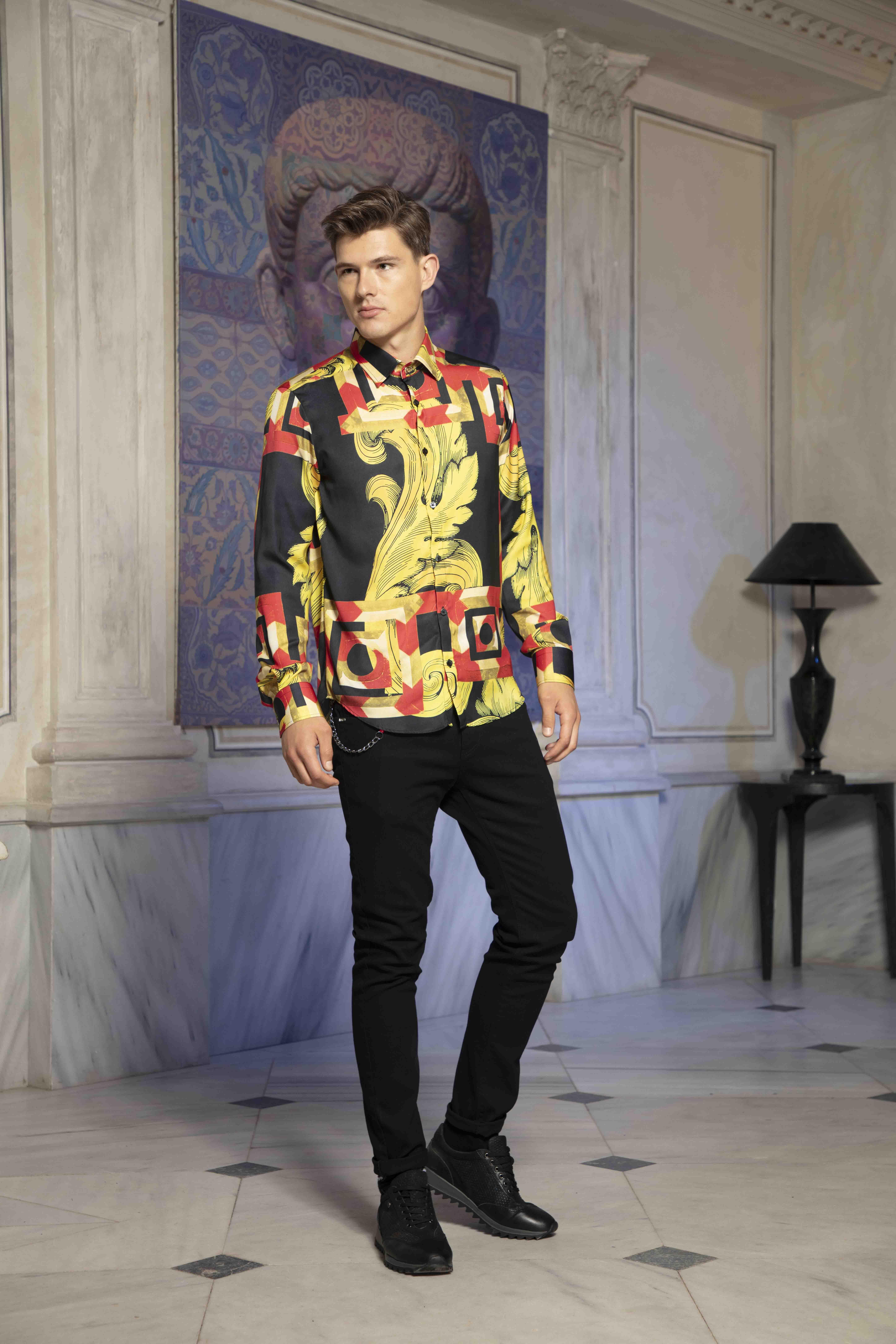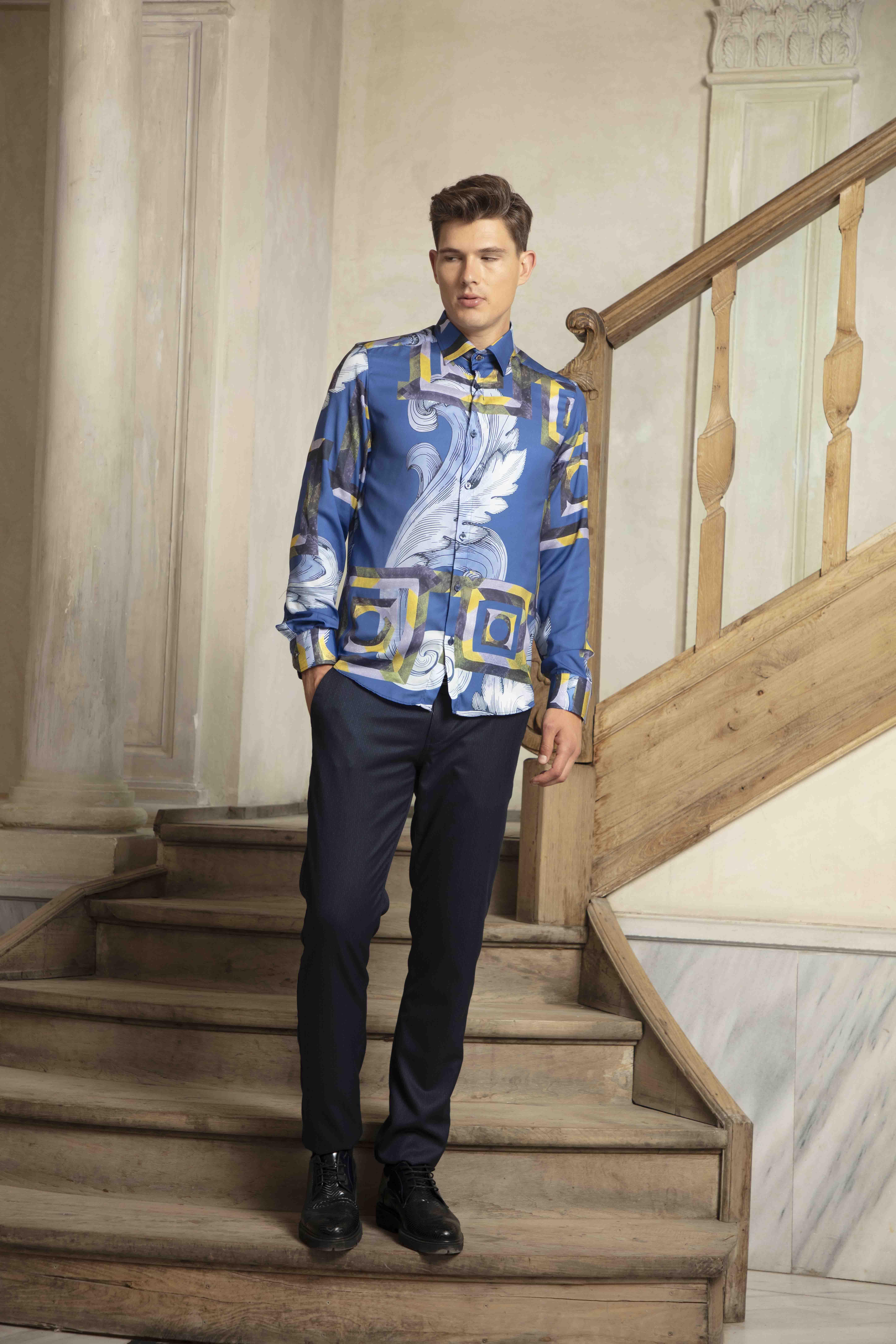 Barok Baskılı Kare Detaylı Saks Gömlek (G-71206)